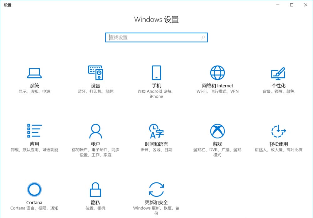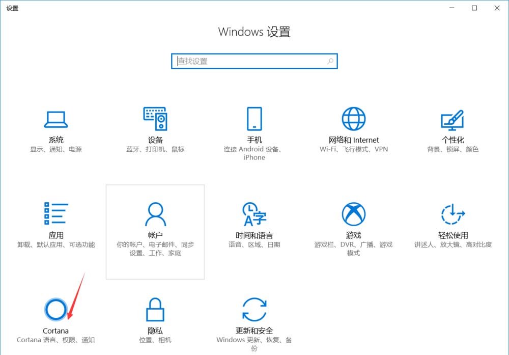 4、找到設置最后一排,點擊cortana,可以設置其相關的語言,通知和權限相關,如下: