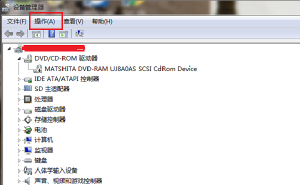 3、點擊操作之后,選擇掃描檢測硬件改動,系統會自動重新加載設備,如下圖所示: