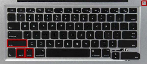 3)在內建鍵盤上,同時按下(左側)Shift-Control-Option 鍵和電源按鈕。