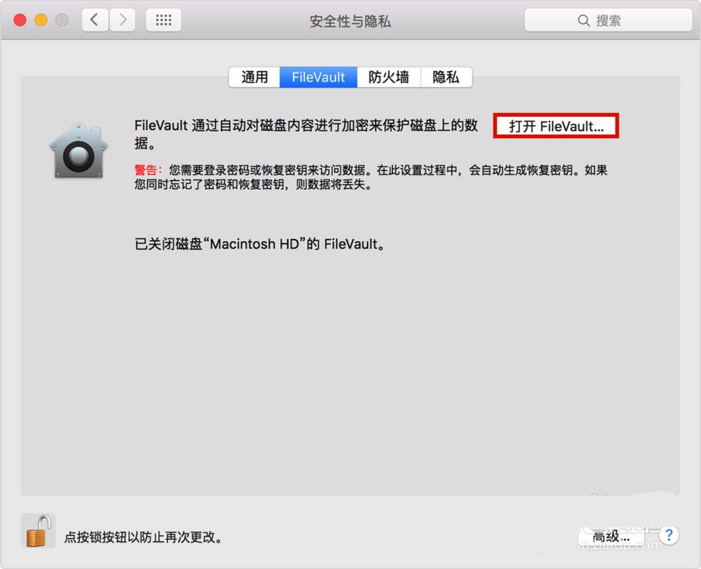 點擊“系統偏好設置”,打開“安全與隱私”,關閉“FileVault”,然后重新開機。