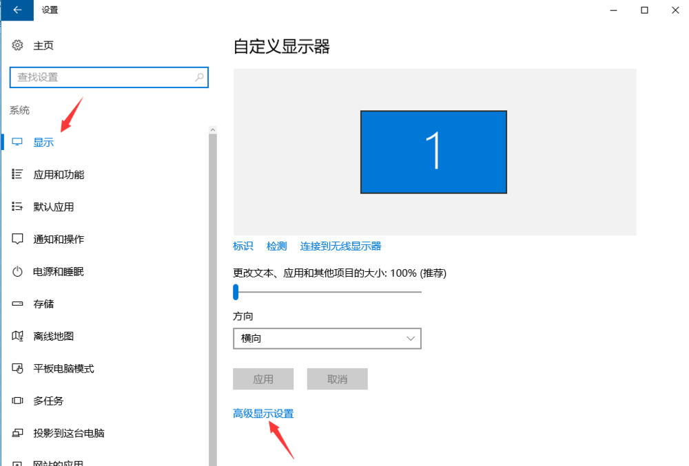 2、選擇第一個(gè)【系統(tǒng)】菜單,在彈出的窗口中,選擇【顯示】-【高級顯示設(shè)置】,如圖所示。