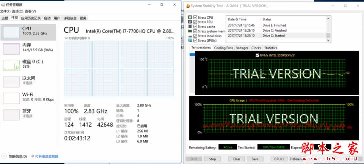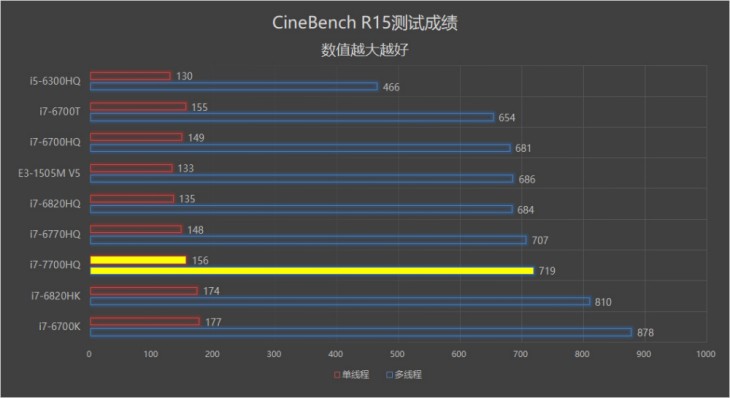 i7-7700HQ 這顆處理器大家已經非常熟悉了,可以說是筆記本上最常見的四核心八線程產品,其基于 Intel KabyLake 架構設計,主頻 2.8GHz,睿頻 3.8GHz,TDP 為 45W。在 CineBench R15 測試中,其單線程成績為 156cb,多線程成績為 719cb。