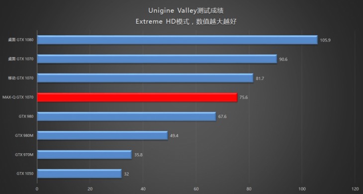 在我們不經常做的 Unigine Valley 中,搭載MAX-Q 的GeForce GTX 1070的最終成績為 75.6fps,與移動端GeForce GTX 1070 差距并不是很大。