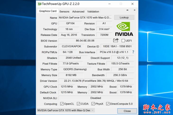 在開啟測試之前先看看搭載 MAX-Q 設計的 GeForce GTX 1070 與普通版本有何不同,在 GPU-Z 的信息監測中,其基于 GP104 核心,擁有 2048 個 CUDA 單元,顯存位寬 256Bit,顯存帶寬 256GB/S,顯存容量 8GB GDDR5,除頻率外,整體的規格與標準版移動端 GeForce GTX 1070 幾乎沒有差別。
