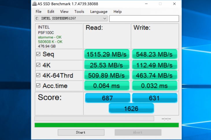 機械師 PX5 所配備的 PCIe SSD 是我們非常熟悉的 Intel 600P,容量為 512GB,我們使用 AS SSD 對其進行測試,其讀取速度為 1515.29MB/S,寫入速度為 548.23MB/S,4K 和隨機讀寫的讀速也非常亮眼。