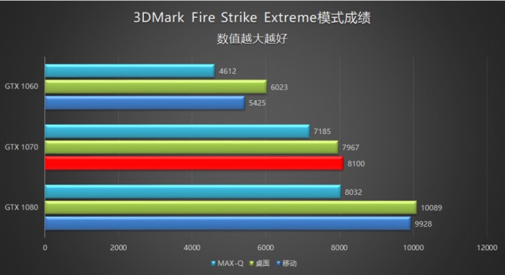 在最能體現高端 GPU 性能差異的 3DMark Fire Strike Extreme 中,搭載 MAX-Q 的 GeForce GTX 1070 與移動端 GeForce GTX 1070 的性能差距為 11%,圖形分數為 7185。