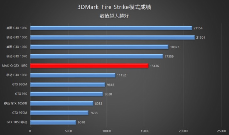 在 Fire Strike 測試中,MAX-Q 的最終圖形分數為 15436,與移動端 GeForce GTX 1070 同樣存在 11% 的性能差距。