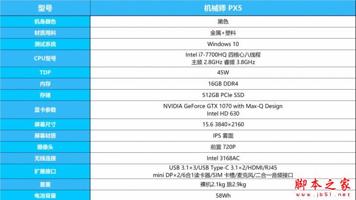 機械師 PX5 采用了 GeForce GTX 1070 GPU,并搭載了 Max-Q 設計,最薄機身設計僅 18.6mm。Max-Q 設計是一種創新方法,用于設計世界上超薄、超快和超低噪音的游戲筆記本電腦。其基于藍天 P957HR 設計,機身最薄處僅為 18.6 毫米,重量則僅為 2.146 千克,整機的便攜性極為出色。硬件配置方面,其擁有 GeForce GTX 1070 GPU 獨顯和酷睿 i7-7700HQ 處理器,整機性能非常高。下面我們將一起走進這臺 MAX-Q 游戲本的內心,看看它的實力究竟如何!