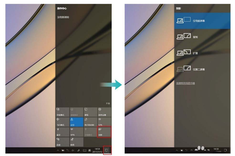 4、連接好后,外接顯示器或投影儀默認(rèn)顯示 MateBook 桌面相同內(nèi)容。你可以在計算機鍵盤點擊 F8 按鍵(或點擊屏幕右下角的操作中心圖標(biāo)-投影圖標(biāo)),在打開的“投影”列表中選擇你想要的投影方式。