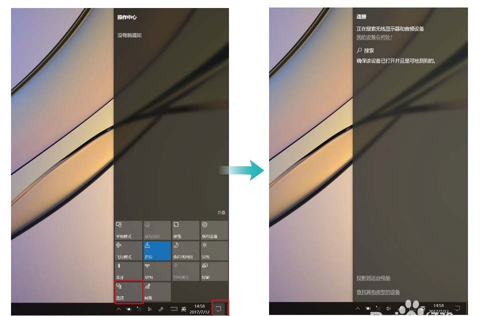 2、在 MateBook 中點擊屏幕右下角的操作中心圖標(biāo)-連接圖標(biāo),在“連接”列表中,選擇無線顯示器或投影儀的名稱,連接設(shè)備。