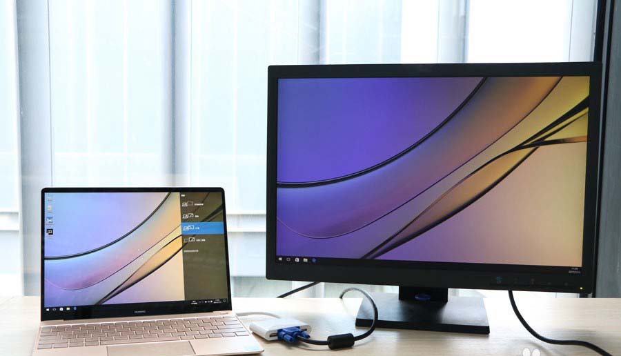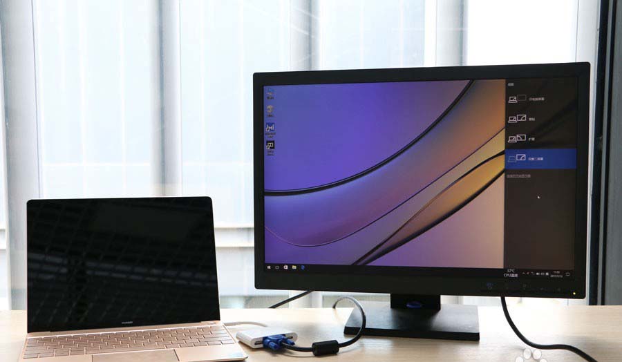 3、擴展: MateBook顯示全部內(nèi)容,外接顯示器一開始顯示系統(tǒng)界面,你可以將某應(yīng)用移到外接顯示屏中顯示。這樣你既可以在外接顯示器中播放教學(xué)視頻,又可以在 MateBook 中做筆記了,真的很方便!