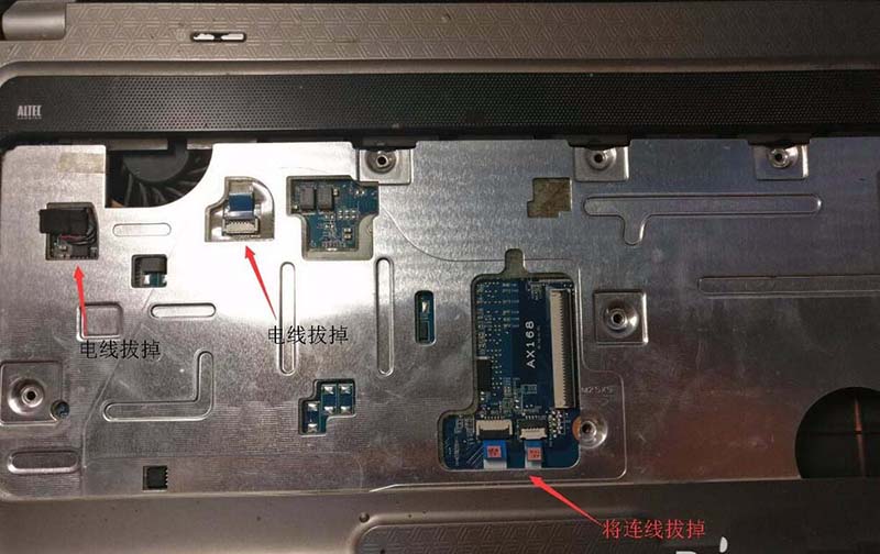 3、拆卸鍵盤,將電腦背面的螺絲全部拆卸,用手將鍵盤扣下來,會發現底下連有排線,將排線取下,鍵盤分離,進一步取下鍵盤下底板