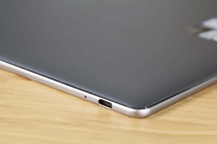 華為MateBook E的機身接口與市面上主流的二合一筆記本一樣,機身右下方配有一個USB Type-C接口(USB 3.1標準,10Gbps,兼充電接口),機身左上方配有一個耳機/麥克風二合一接口。