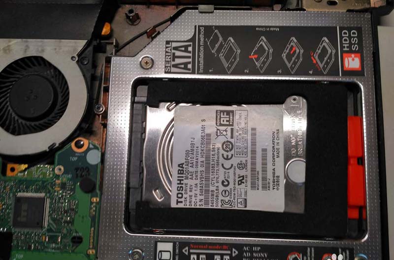 2、在如圖所示的1位置,將原本的光盤驅動拆卸掉,將2位置的硬盤拆下來,換上自己買的固態硬盤,將從2位置拆下來的主機硬盤裝進自己買來的硬盤托架上,再固定到原光盤驅動位(如圖2)