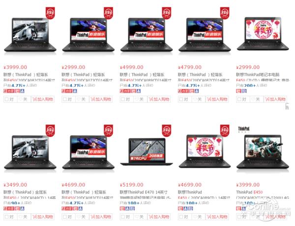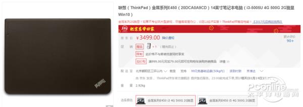 我們首先去JD查詢下ThinkPad E450,是JD銷量前十的機(jī)器。我們可以看到自營(yíng)共有七款E450,價(jià)格分布為2999元到4999元,共分布在兩個(gè)頁(yè)面中,其中有一個(gè)頁(yè)面為E450單獨(dú)的銷售頁(yè)面,為E450金屬系列,僅有兩款不同配置的產(chǎn)品,另一個(gè)頁(yè)面則是與E470混合在一起的頁(yè)面,為E450輕薄系列,不過(guò)E470的出現(xiàn)也證明這將是升級(jí)產(chǎn)品替換老一代產(chǎn)品的節(jié)奏。