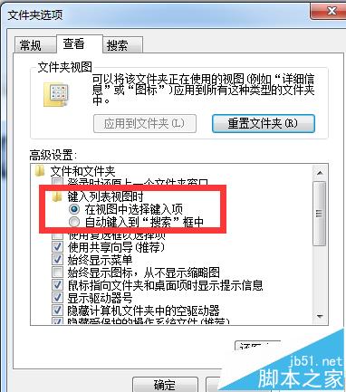 2、切換到“查看”選項卡,在列表單找到“鍵入列表視圖時”的子項,把“自動鍵入到搜索’框中”改為上面一個“在視圖中選擇鍵入項”就可以了。