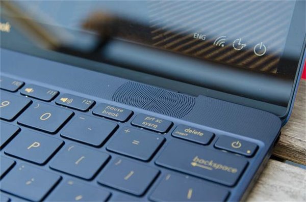 在鍵盤的上方是兩個立體聲揚聲器,華碩表示這樣的設計可以帶來更好的音質體驗,雖然我對于揚聲器的效果并不敏感,但是ZenBook 3內置的哈曼卡頓揚聲器的確提供了不錯的效果和音量。不過相比較之下,低音效果稍顯不足。