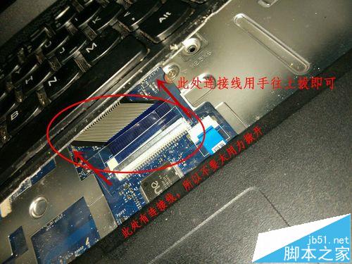 5、拿掉鍵盤時要注意,不要用太大力,此處有連接線需要先拔掉!方法如圖
