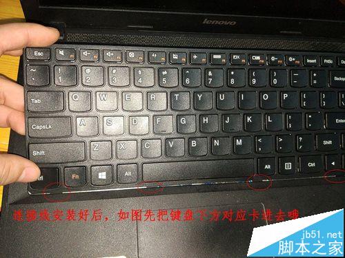 7、安裝好連接線后,如圖先把鍵盤下方對應卡進去,然后再輕輕全部壓下去即可