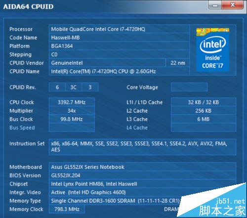 2、酷睿i7 4720HQ處理器。這是一款BGA封裝的移動四核i7產品,屬于Haswell平臺產品,基于22nm制程,采用四核心設計并且支持超線程至8個線程,核心代號為Haswell-MB,默認主頻為2.6GHz支持睿頻至3.4GHz,3級緩存6MB,TDP為47W。