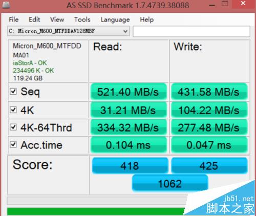 1、華碩FX-Plus搭載了一塊128GB的固態硬盤,我們利用ASSD Benchmark對其進行了測試。這款鎂光M600固態的測試結果十分理想,綜合成績超過了1000分,4K隨機讀取超過了30MB/S,對玩家來說是一款提升日常操作體驗的利器。