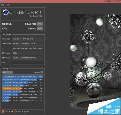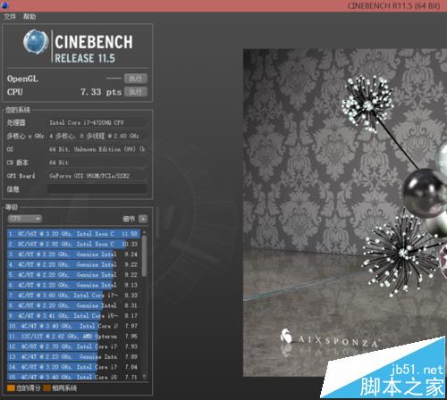 3、了解處理器的基本信息之后,我們采用 CINEBENCH R11.5和 R15 系列軟件對其性能進行了評估,該軟件能夠對處理器的理論渲染能力進行反饋分析,這顆酷睿i7 4720HQ 處理器很快的完成了全部的測試內容,最終R11.5獲得 7.33 pts,R15獲得 590 cb,屬于移動處理器的高端型號。