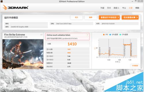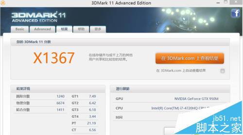 4、華碩FX-Plus搭載的GTX950M獲得了3DMark 11 X 1367, 3DMark Firestrike EX模式 x1410的成績,在我們評測過的GTX950M游戲本中處于正常范圍,中上游排名位置。