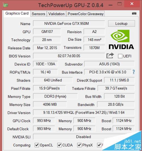 2、我們簡單看看華碩FX-Plus搭載的GTX950M的性能情況。這款GTX950M 顯卡采用GM107麥克斯韋核心,擁有640個流處理器、16個光柵單元、40個紋理單元,核心頻率為993Mhz,搭配4GB大容量顯存,貸款為28.8GB/S,是時下非常火熱的移動GPU產品。