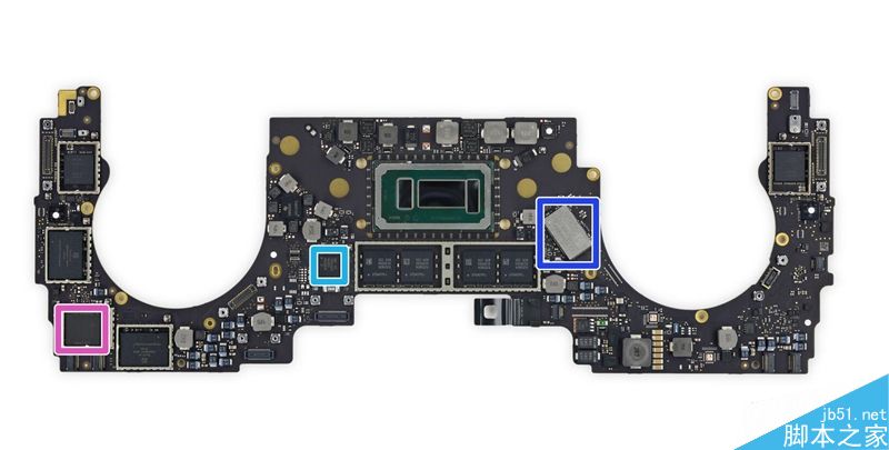 紅框內是兩顆SanDisk 64GB NAND閃存(與主板正面的兩顆組成容量256GB的板載SSD);土黃色方框內的芯片型號為APL1023 343S00137,推測是蘋果定制的TouchBar控制芯片;玫紅色方框內是恩智浦66V10 NFC控制器,包含Secure Element 008和恩智浦PN549。