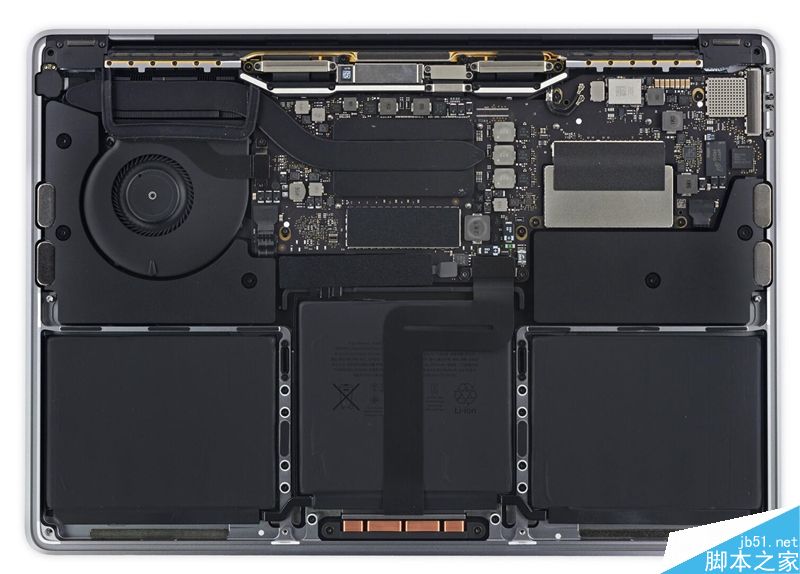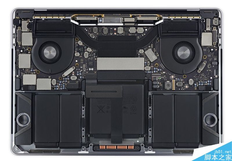 上面兩幅照片中,位于上部的是TouchBar版Macbook Pro的內部構造,相比下部圖片中的普通版MacBook Pro,風扇的數量增加到了兩個,但每個風扇更小,同時電池總體積有明顯的縮小。這意味著續航的縮短。