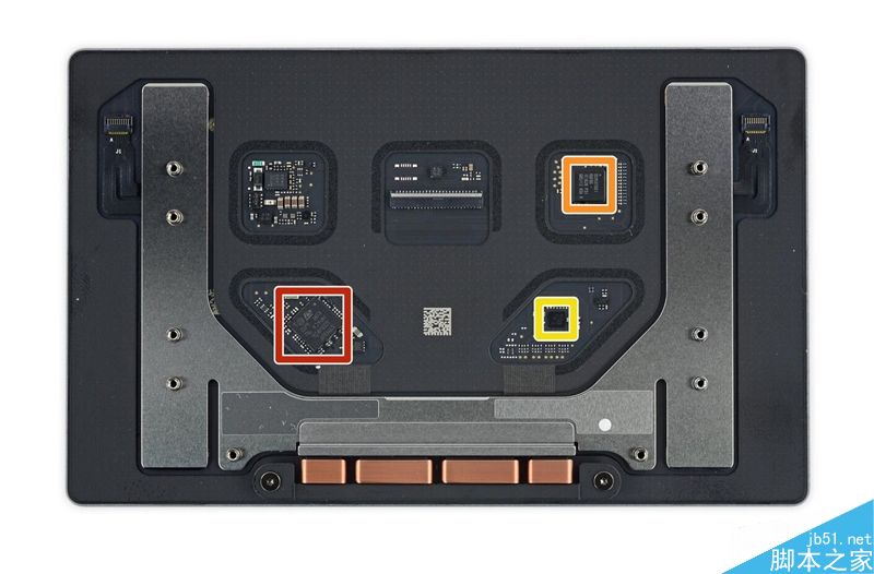 觸摸板背后的主控芯片、電源芯片和壓感芯片。