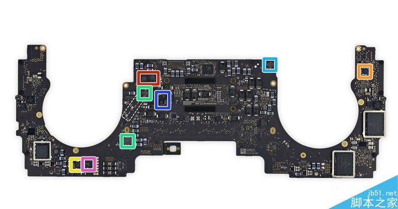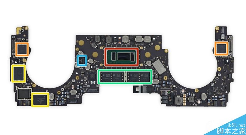 重點來了,紅色方框中的是Intel Core i5-6267U雙核處理器;主板兩邊的土黃色方框中是Intel JHL6540 Thunderbolt 3控制器;正黃色方框中的是兩顆SanDisk 64GB NAND閃存(主板背后還有兩顆,組成容量256GB的板載SSD);綠色方框中為四顆三星DDR3 DRAM芯片,構成8GB內存。
