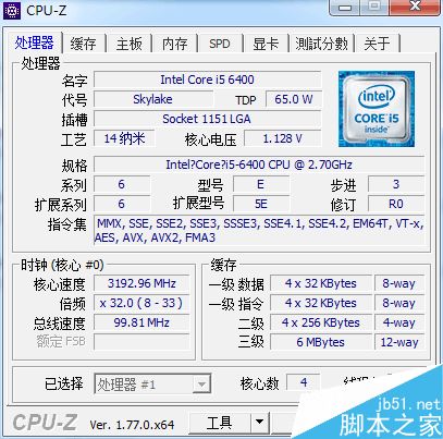 CPU-Z上顯示的處理器參數比較完整,可以看到搭載的是i5-6400處理器,屬于Intel六代酷睿系列桌面級處理器。采用14nm制程,TDP為65W,R0步進,L3級緩存為6MB,四核四線程設計。