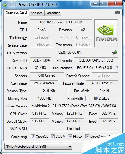 顯卡方面搭載的則是NVIDIA GeForce GTX 950m,4G GDDR5獨顯,對現在一些大型的單機游戲來說已經可以說是入門級的顯卡了。廠商識別為CLEVO/KAPOK(1558),默認頻率為915MHz,Memory頻率為1253MHz。
