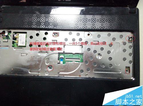 3、鍵盤拿掉后,拆掉鍵盤后面的面板螺絲,一共5個(gè)螺絲,我已經(jīng)標(biāo)注,大家拆的時(shí)候注意看清楚,看圖說話,螺絲去掉就可以去掉前面板的蓋子了,下來主板上有三個(gè)螺絲,我已經(jīng)標(biāo)注,擰開螺絲就可以去掉主板嘍。如圖
