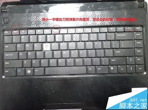 2、正面打開計(jì)算機(jī),看鍵盤上方,如圖用小一字螺絲刀把彈簧片向里頂,頂進(jìn)去的時(shí)候,把鍵盤向起翹,三個(gè)全部起開,鍵盤就開了,把鍵盤連接線拆開即可。