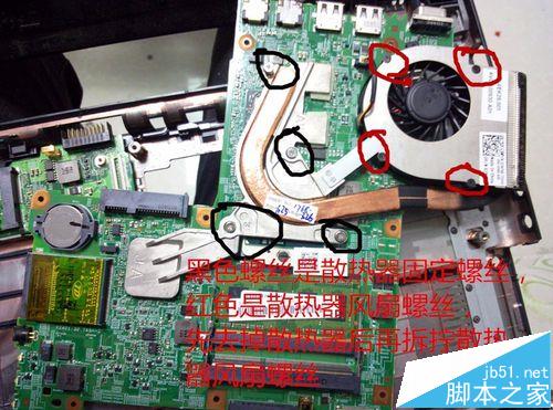 4、然后,開始拆筆記本主板上的散熱器螺絲,把散熱器去掉后再拆散熱器風(fēng)扇上的螺絲,如圖,接下來更換好散熱器風(fēng)扇后,把導(dǎo)熱硅脂在處理器或者散熱器接觸面涂勻再進(jìn)行固定即可。