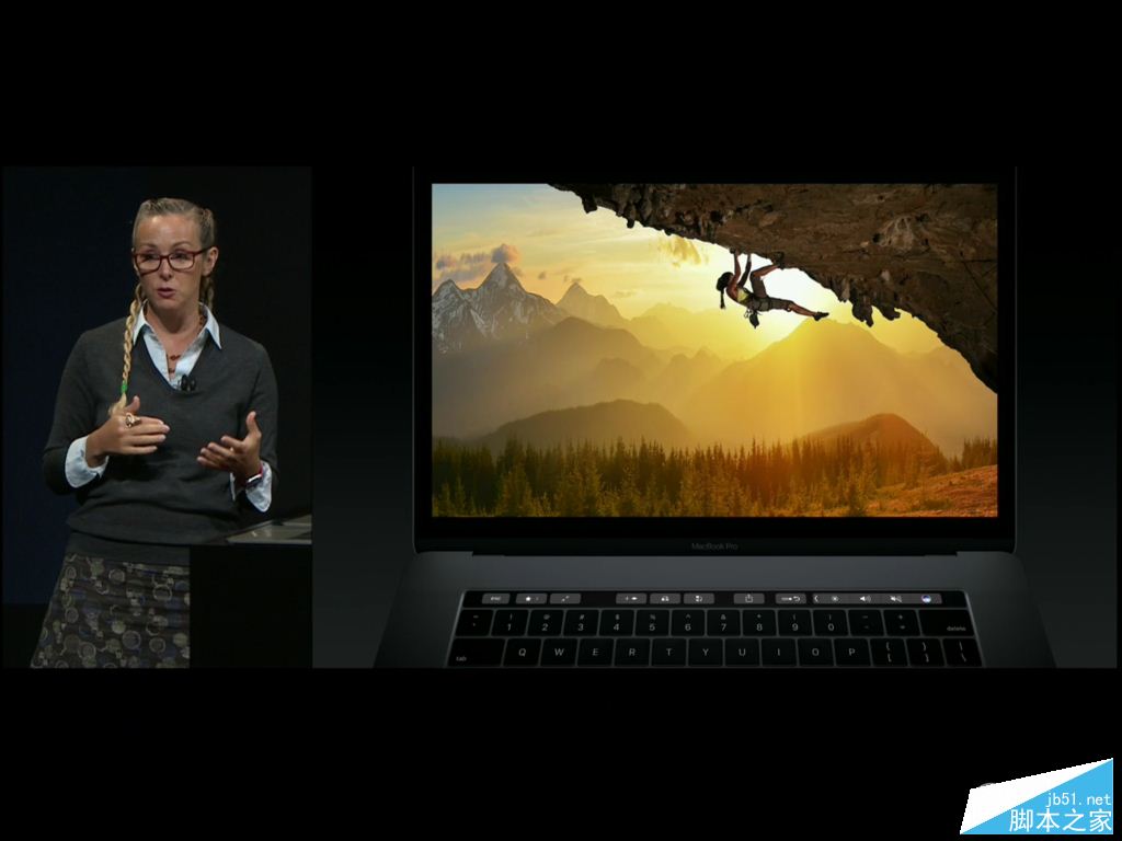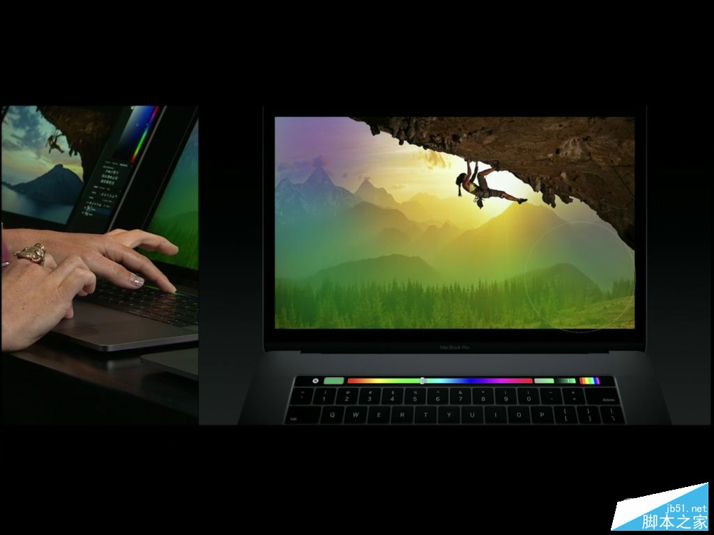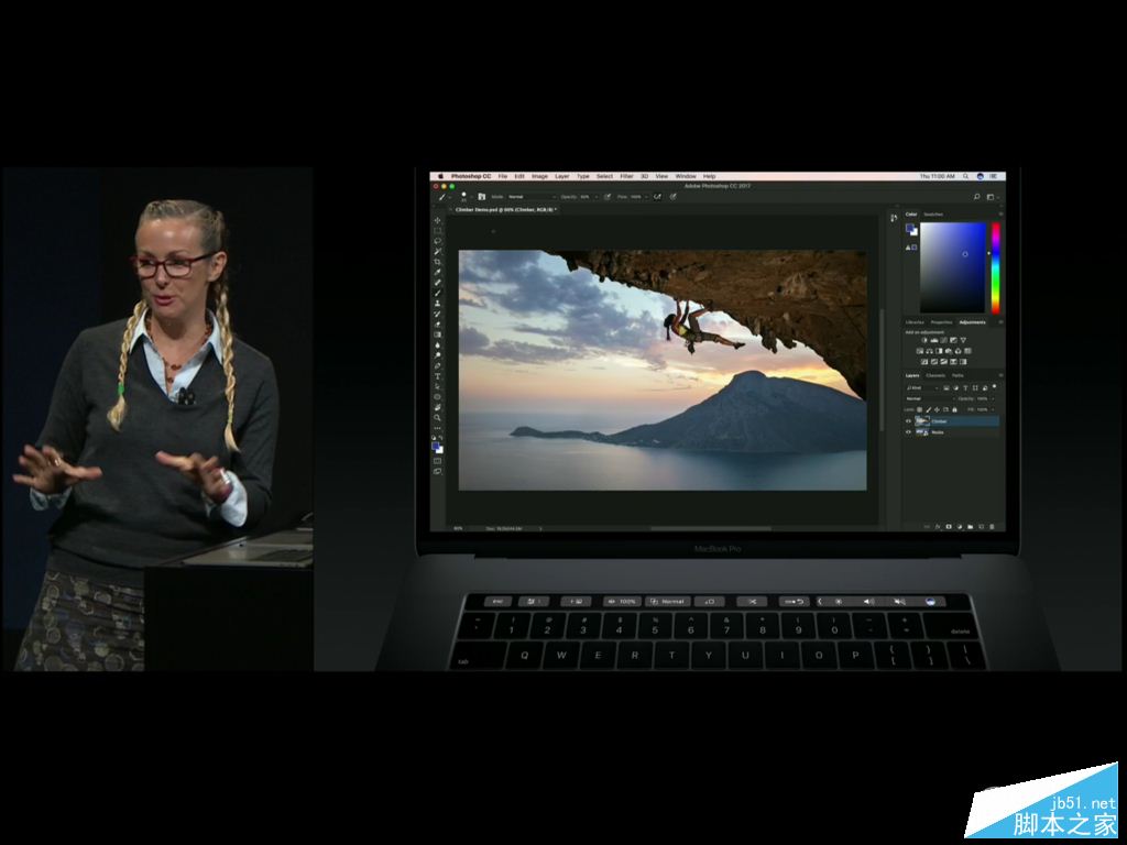 用 PS 配合 Touch Bar 編輯圖片,你可以全程看著全屏圖片來完成了,完不需要另外打開工具視窗,直接用 Touch Bar 對照片進行各種調整。現場演示了對照片進行調色,右手選擇范圍,左手選擇顏色的操作,快速而且便捷。全程沒有用到鼠標,雙手在鍵盤就可以完成。