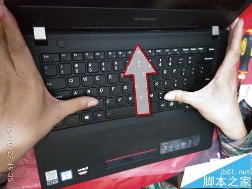 2、把筆記本翻轉到正面向上,雙手大姆指稍用力向下壓著鍵盤,向如圖箭頭所示的屏幕方向推動鍵盤。