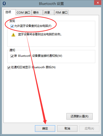2. 彈出“Bluetooth設置窗口”,“選項”下勾選“允許藍牙設備查找這臺電腦”后點擊“確定”。
