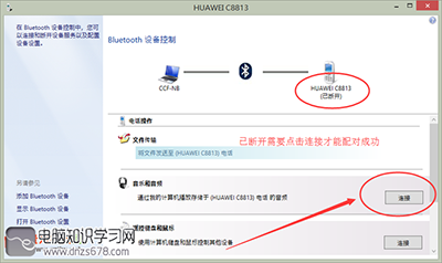 如果需要斷開連接,只需手機關閉藍牙或取消配對。以后打開藍牙自動連接不成功,打開藍牙控制面板,點擊“連接”即可。