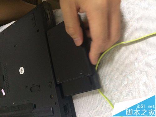 2、將筆記本中的驅動器拆下來:講筆記本放過來放,可以看到背面左側有個鎖鍵,將其推至“開鎖”狀態,然后往左推動,驅動器便很方便地被拆下來了。