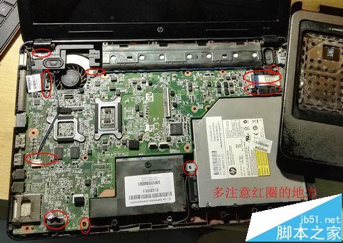 4、撬開后是這樣的,把螺絲旋下,自己分類放好,記住位子,別等下忘記是哪里的了,注意紅圈的地方。