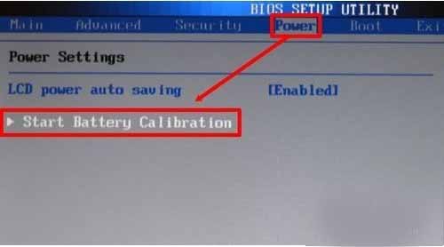 6、使用左右鍵(← →)定位到 Power (電池) 設置項,再使用上下鍵(↑↓)定位到 Start Battery Calibration (開始電池校準)回車確認。