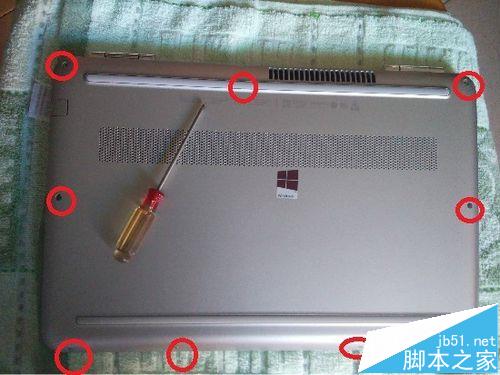 2、把筆記本放在毛巾上后開始用十字螺絲刀拆卸螺絲,螺絲我已經幫你們標出來了,拆卸過程中要記住每個螺絲的位置,不可搞混