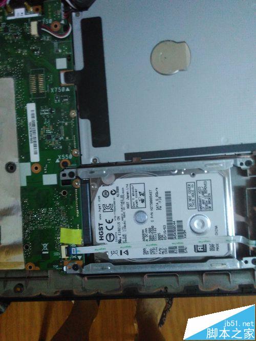 4、取下硬盤。硬盤有4顆螺絲,并且插在主板插槽中,擰下螺絲,向右上拔出硬盤,注意硬盤上的連接線,拔下兩面的連接線。