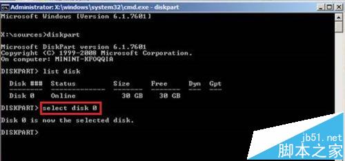 4、然后繼續輸入命令“select disk 0”回車,如圖所示。