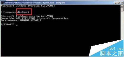 2、在DOS窗口中輸入“diskpart”,并回車進入diskpart模式。