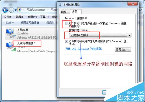 10、選中本地網絡、按右鍵--屬性--共享,勾選“允許其它網絡用戶通過此計算機的Internet 連接來連接”選擇連接到剛剛創建的名稱為“12345”的無線網絡連接2。點擊確定。