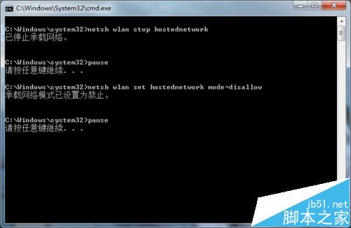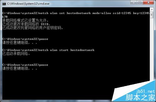 7、按任意鍵繼續...提示已啟動承載網絡,證明無線網絡已經創建好了,按任意鍵退出。但是到這里只完成了一半哦,因為默認的網絡不是共享的,要把它共享給剛剛創建的網絡